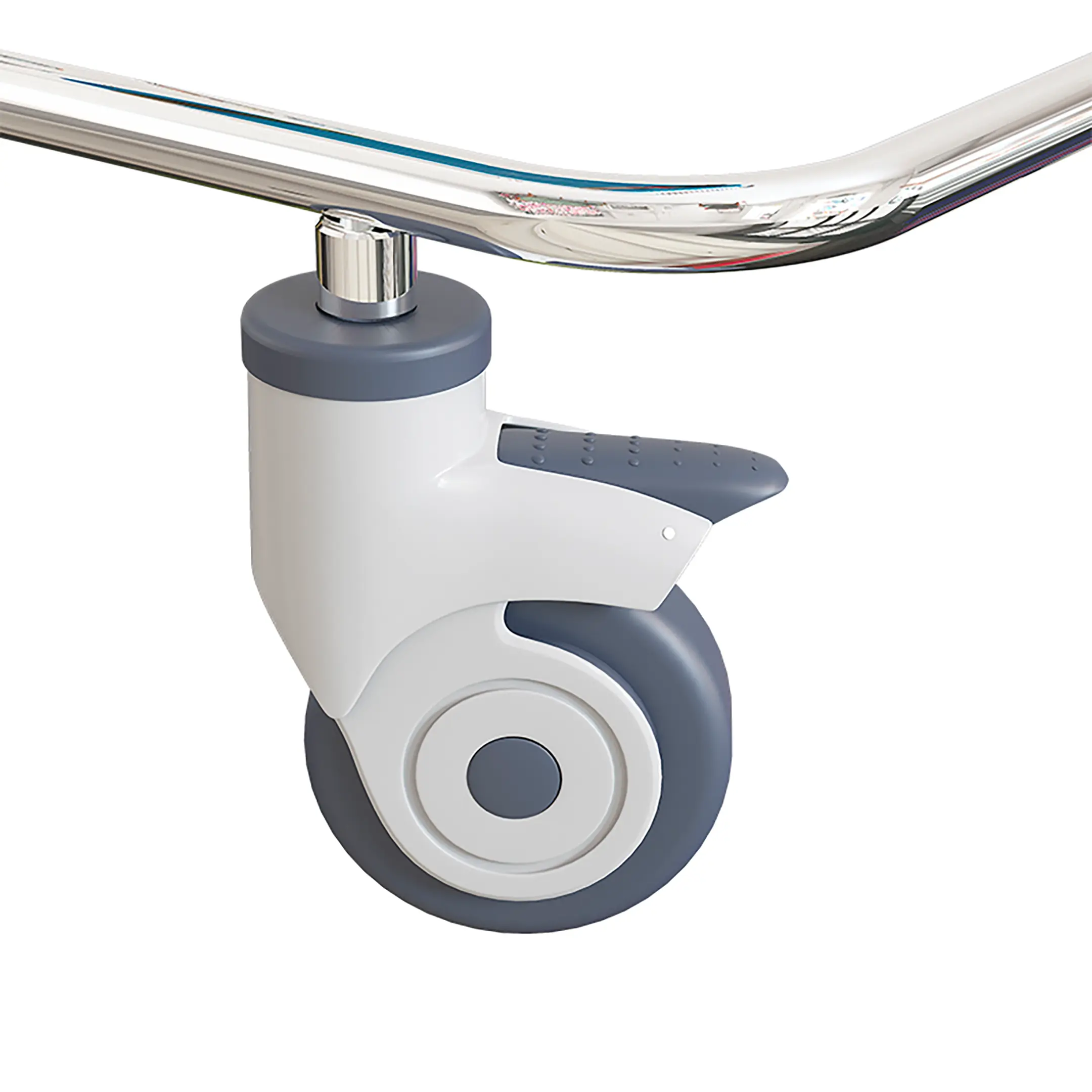• колеса кровати поворотные, самоориентирующиеся, диаметром 100 мм, комплекующиеся надёжной стальной вилкой с прецизионным радиально-упорным подшипником, ободом из полипропилена и шинкой из серого полиуретана, не оставляющего следов на полу (два колеса – с индивидуальным тормозным устройством);