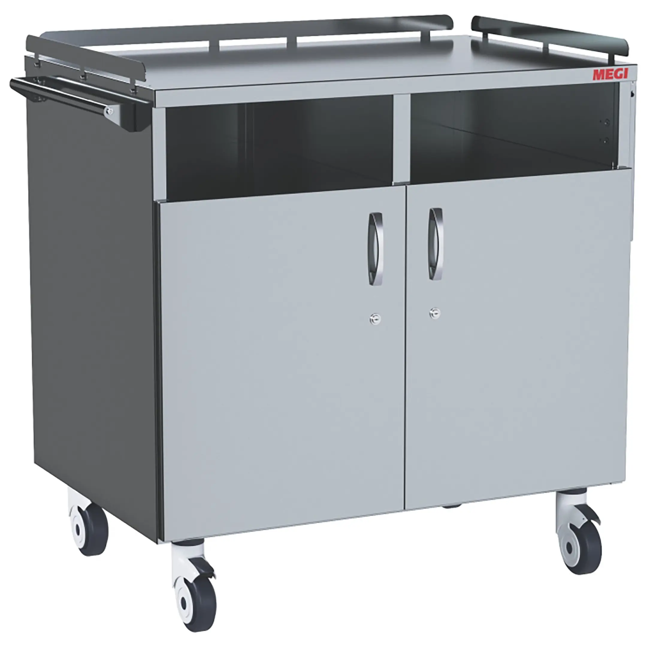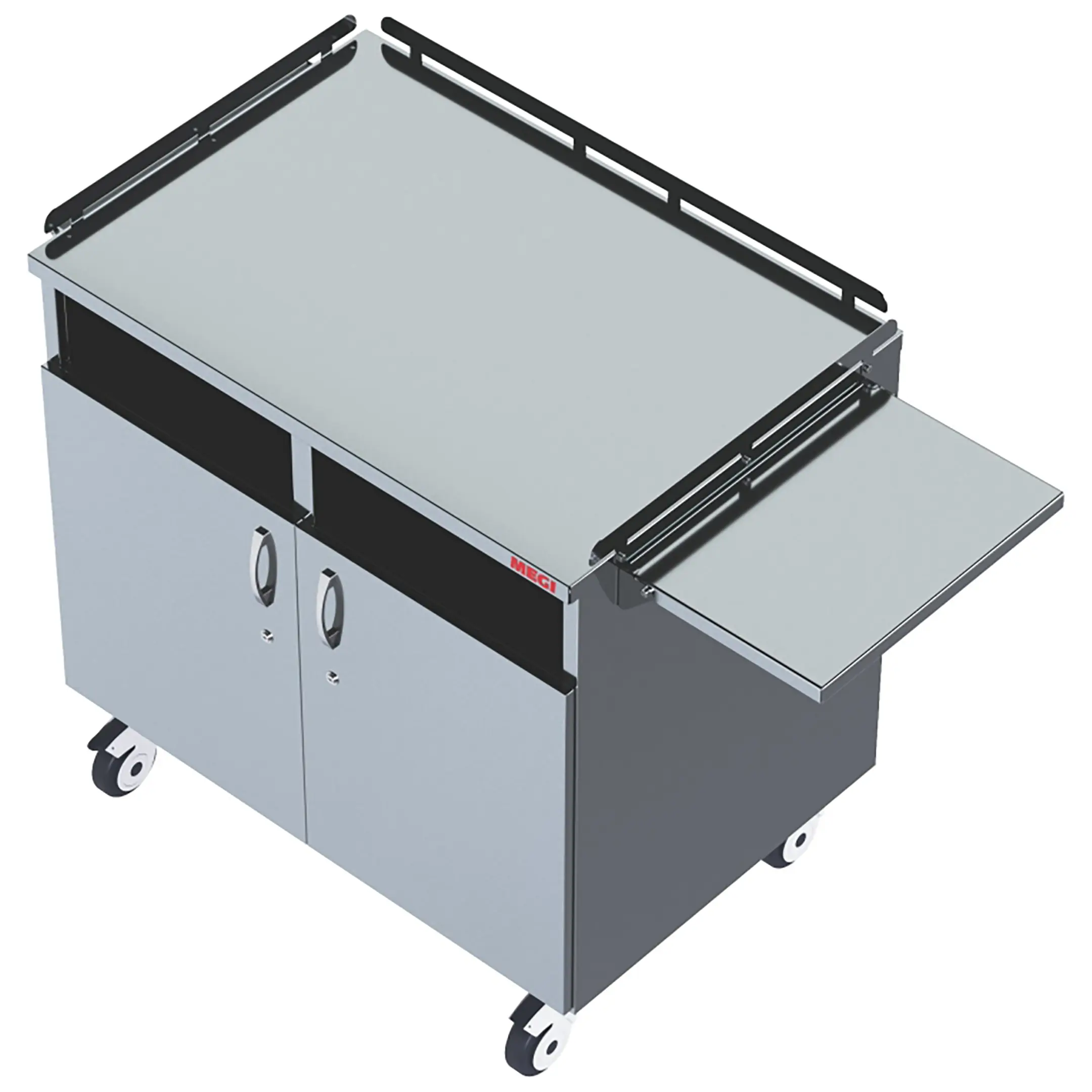 • колеса поворотные, самоориентирующиеся, диаметром 100 мм, комплектуются надёжной стальной вилкой с прецизионным радиально-упорным подшипником, ободом из полипропилена и шинкой из серого полиуретана, не оставляющего следов на полу, два колеса – с индивидуальным тормозным устройством;
