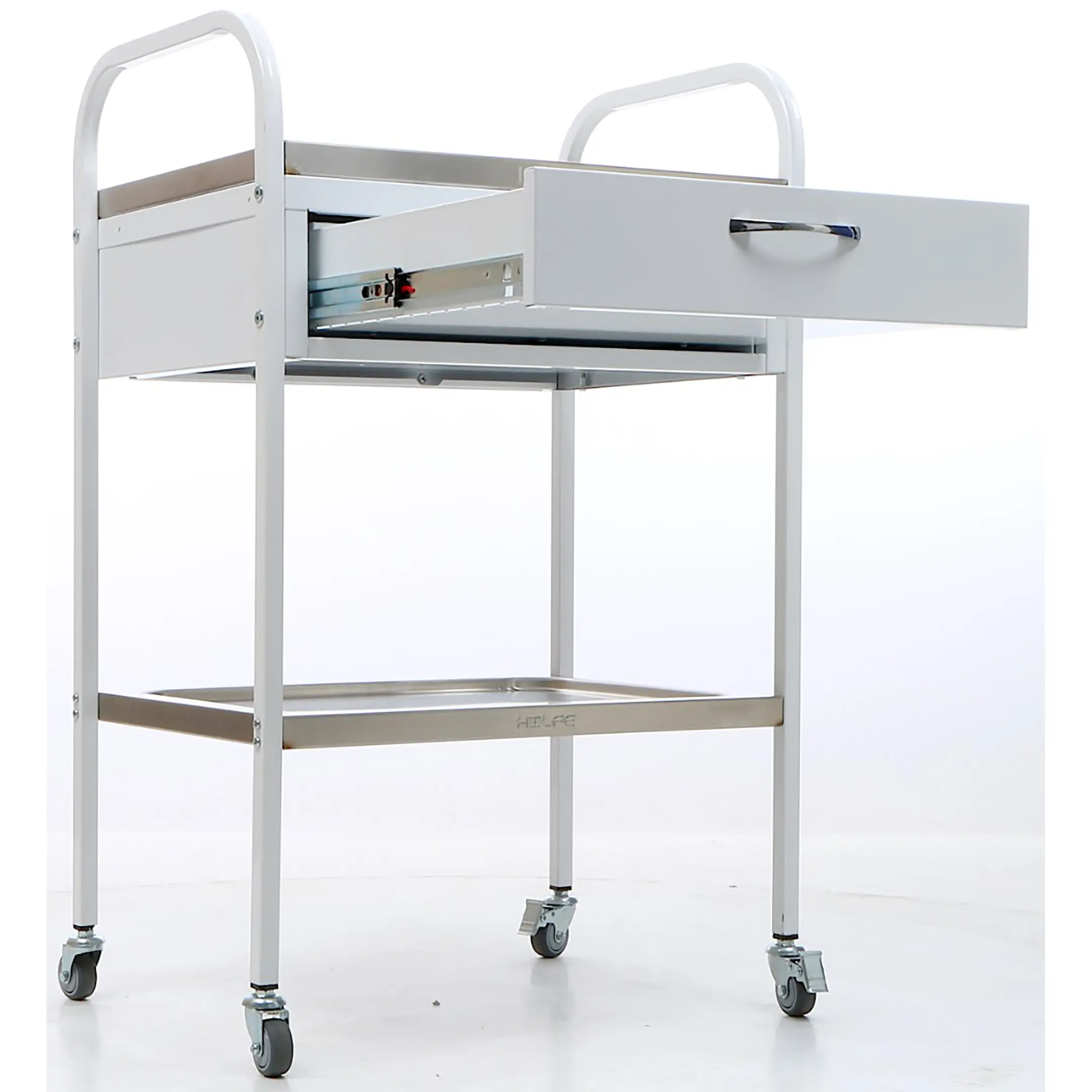 Основное отличие от стола манипуляционного МД SM 1 - вытяжная полка из нержавейки с логотипом HILFE.
