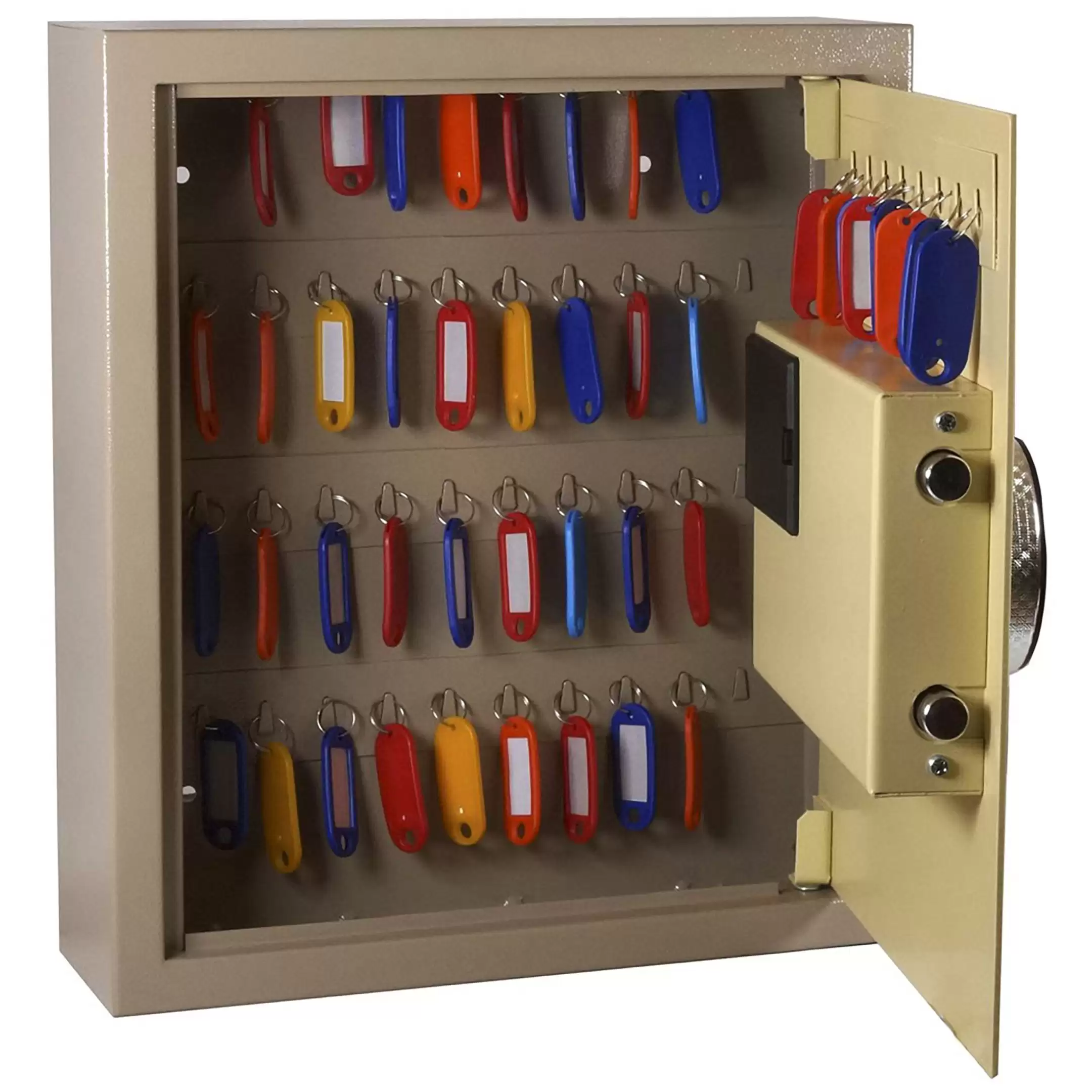 - Готовая система для точного учета и быстрого поиска — пятьдесят пронумерованных ячеек и комплект соответствующих брелков создают четкую и прозрачную систему. Это позволяет вести точный журнал учета, мгновенно находить требуемый ключ и однозначно определять ответственность сотрудников за их выдачу и возврат.