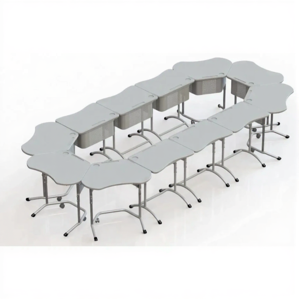 - Эргономичная трапециевидная форма — создает удобное пространство для групповой работы и взаимодействия между учащимися.