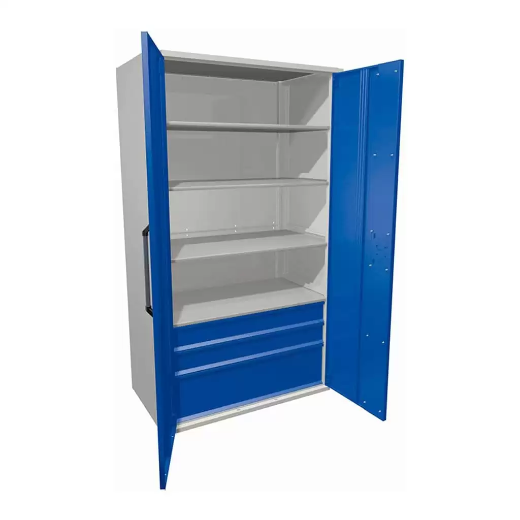 - Надежность и долговечность конструкции — шкаф изготовлен из высококачественных материалов: прочный каркас, устойчивые к нагрузкам полки, надежная фурнитура. Износостойкие покрытия обеспечивают длительный срок службы даже при интенсивном использовании в технической среде.