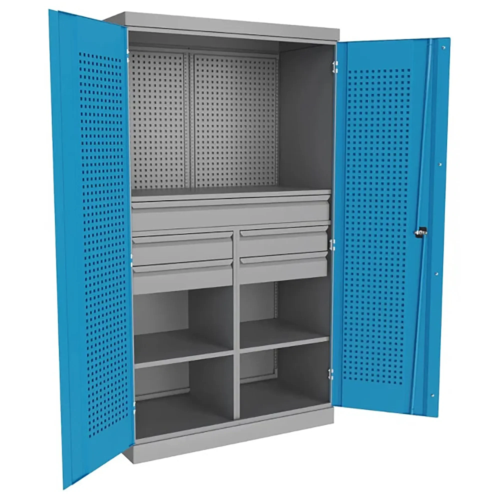 - Оптимизированная организация и высокая вместимость — шкаф сочетает различные типы систем хранения: запирающиеся верхние отделения с полками для крупногабаритного оборудования и несколько выдвижных ящиков с разной высотой фасада для мелкого и среднего инструмента, крепежа и измерительных приборов. Это позволяет рационально рассортировать весь арсенал по типам, размерам и частоте использования, максимально эффективно используя объем.