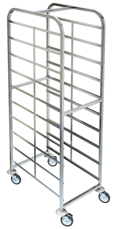 Каркас стеллажа СТС-220/806 ТЕХНО-ТТ представляет собой две надежно сваренные друг с другом одинаковые по размерам рамки. По бокам предусмотрена обвязка, выступающая в качестве ручек для перемещения шпильки. Подносы и противни устанавливаются на парные полозки, размещенные на равном расстоянии друг от друга по всей высоте конструкции. Отсутствие ограничителей у направляющих позволяет вести загрузку/разгрузку с любой удобной стороны.