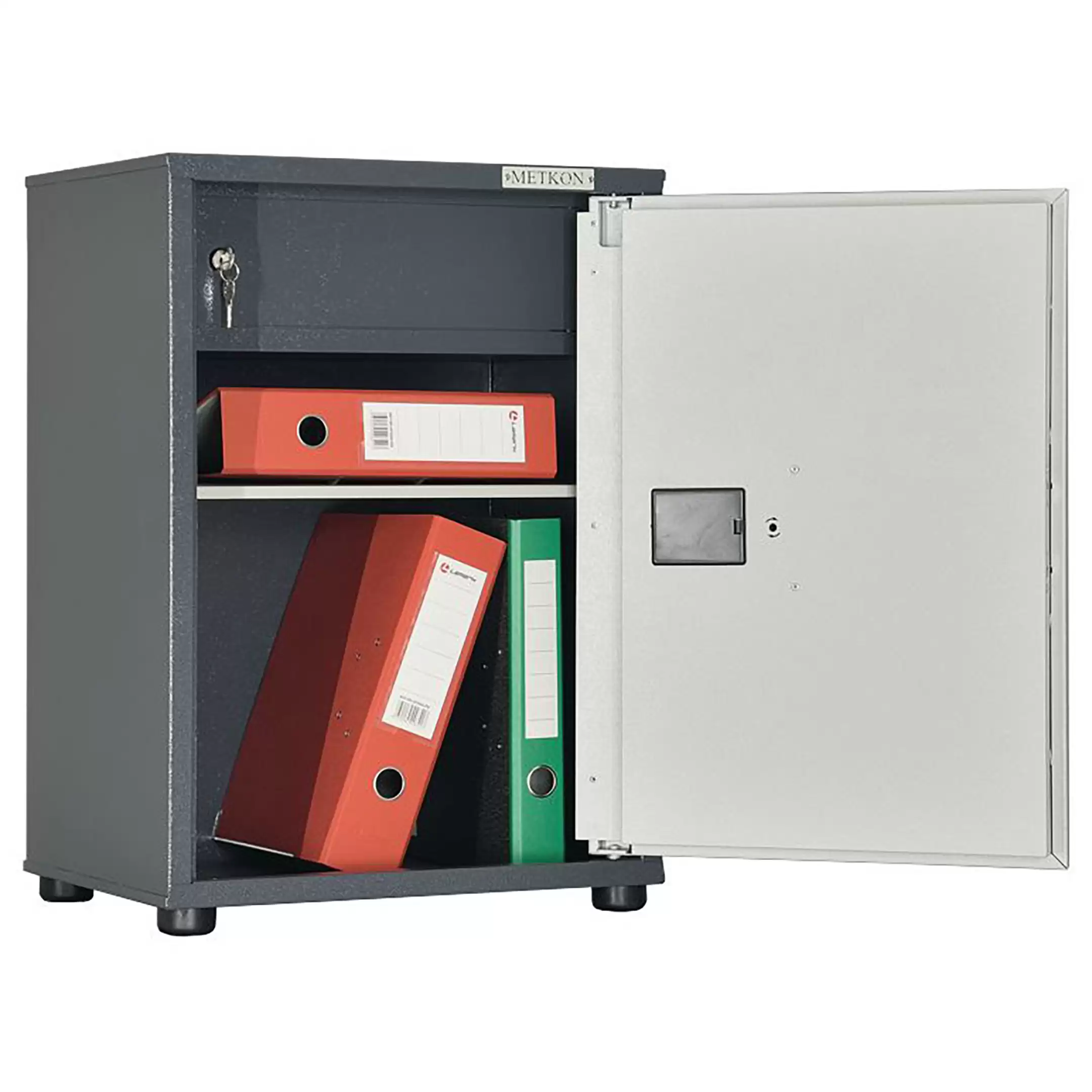 - Надежная конструкция и защита — шкаф изготовлен из прочной листовой стали с антикоррозийным порошковым покрытием. Две распашные дверцы запираются на встроенные замки (обычно по одному на створку), обеспечивая сохранность конфиденциальных документов и ценного имущества.