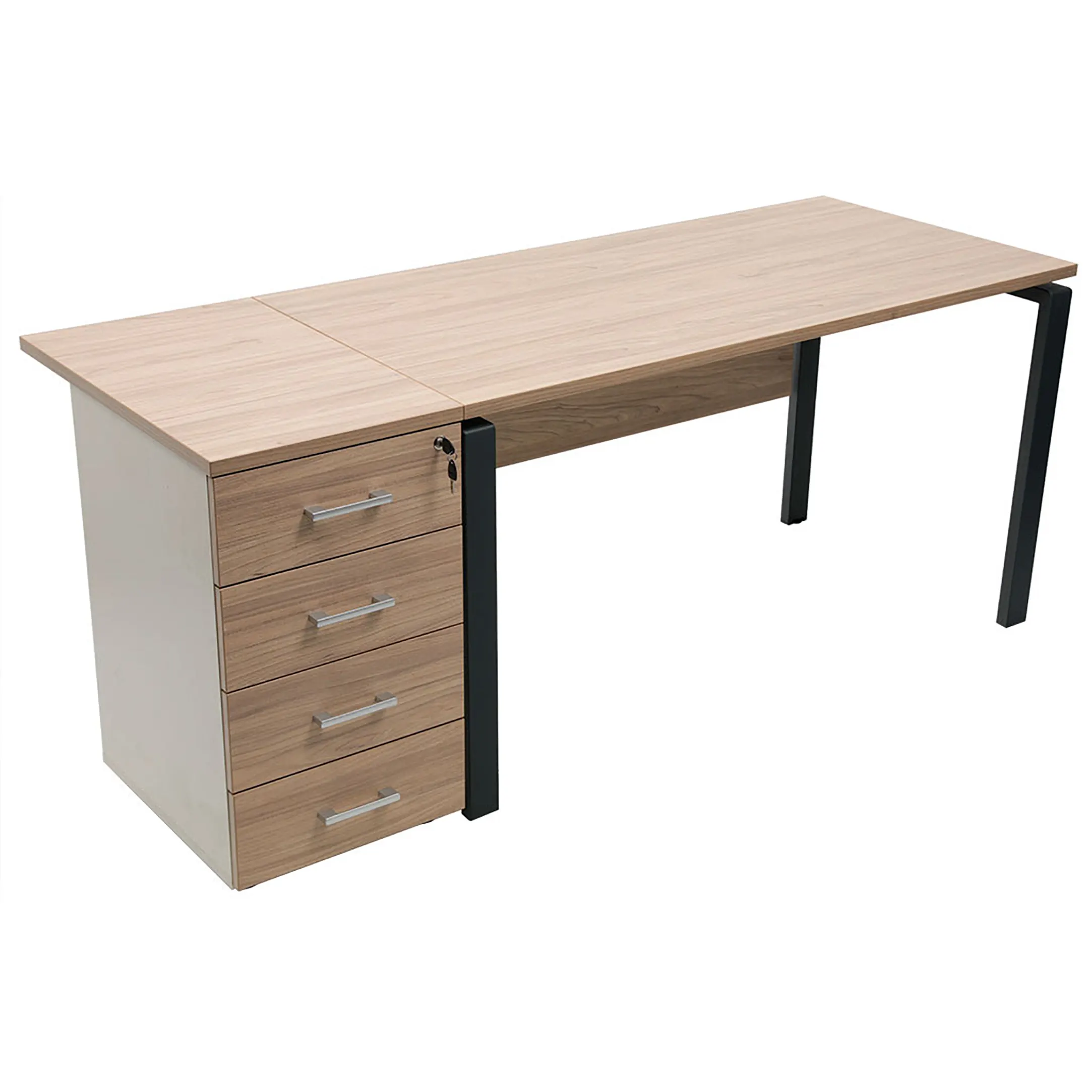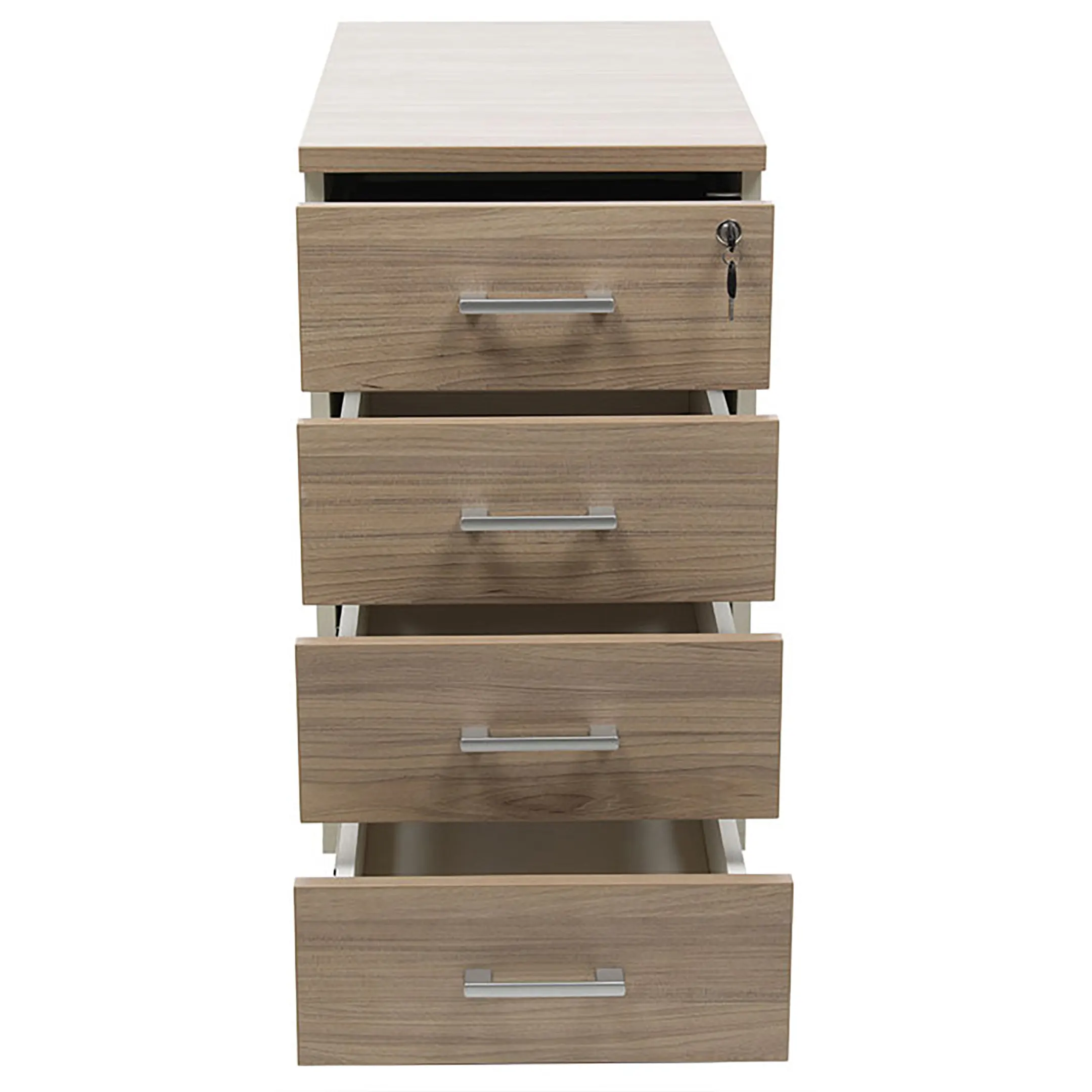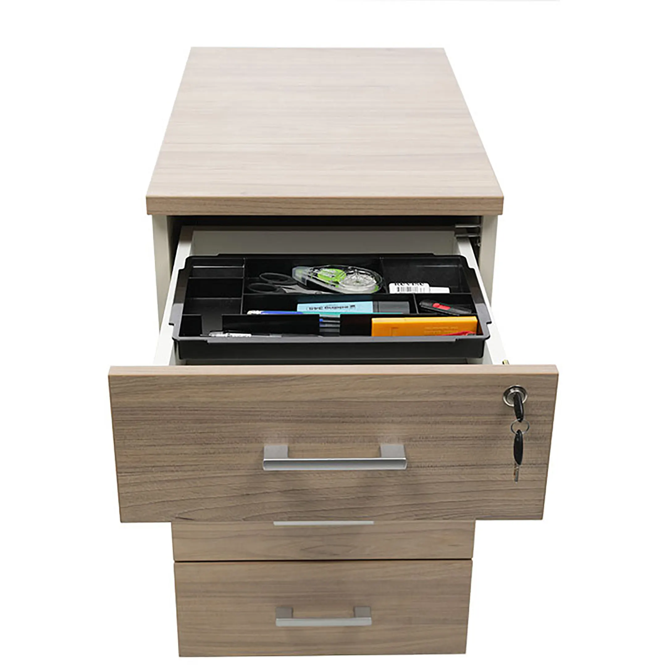 • Тумба снабжена центральным замком и оснащена пластмассовым лотком для канцелярских принадлежностей в верхнем ящике.