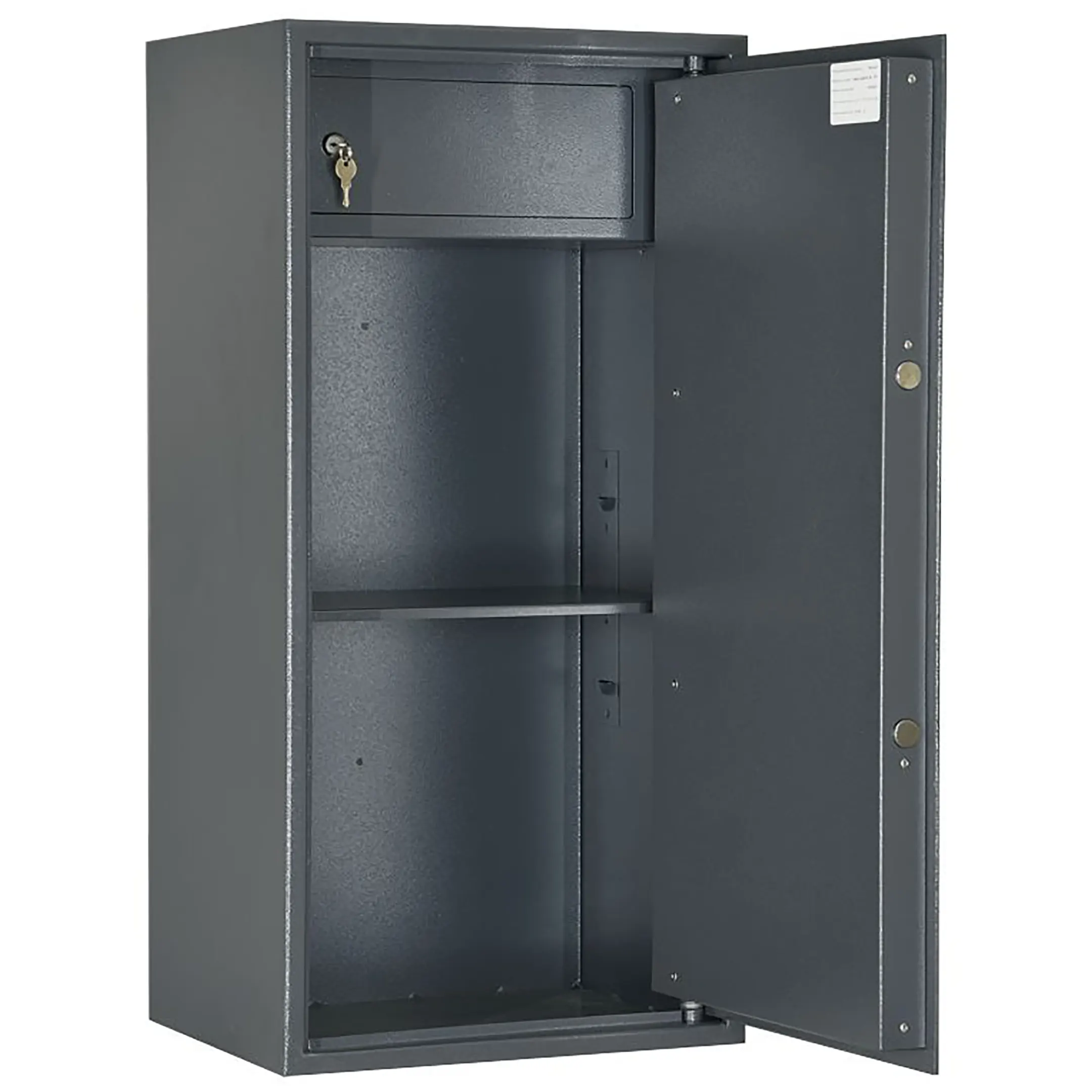 • Сейф двухсекционный, оснащен двумя съемными полками и трейзером.