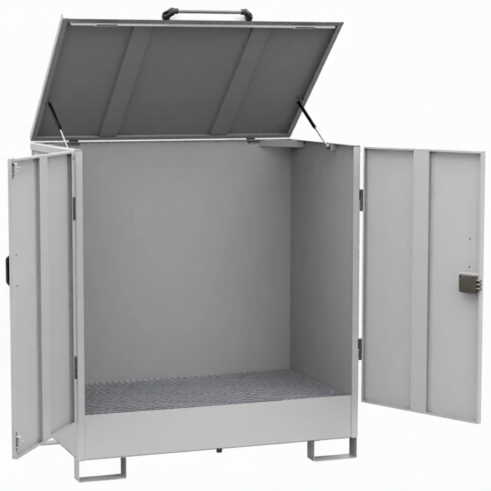 Преимущества депо для 2-х бочек, оцинкованный решетчатый настил, сточный поддон