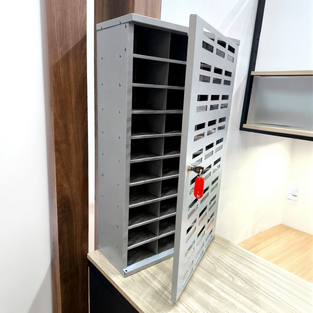 - Практичный и эргономичный дизайн — модель отличается современным внешним видом и продуманной эргономикой. Шкаф легко вписывается в интерьер любого помещения, а процесс сдачи и получения телефонов происходит быстро и без задержек.