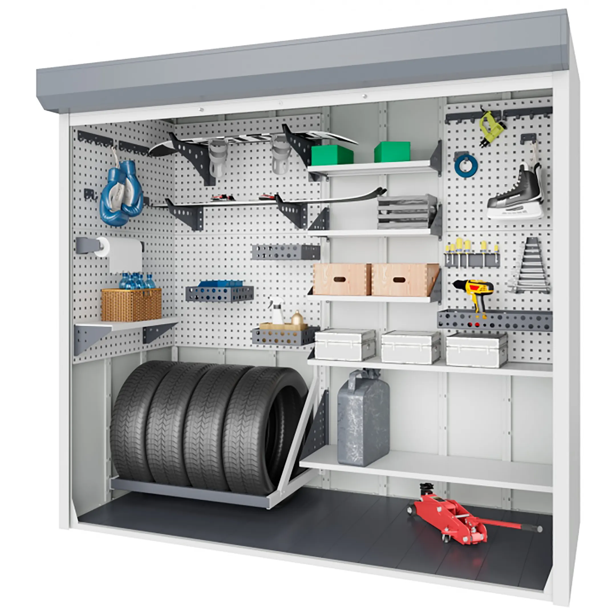 - Оптимальные габариты для крупного инвентаря — высота 2000 мм и ширина 950 мм позволяют удобно хранить вертикально стоящий велосипед (в том числе с высоким рулем), лыжи, сноуборд, садовый инвентарь, чемоданы и другие громоздкие предметы.