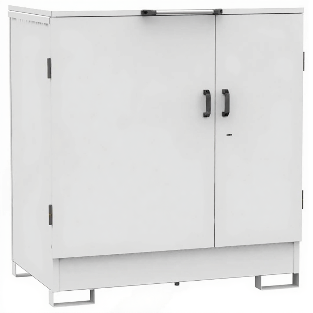 - Защита от несанкционированного доступа и внешних воздействий — запирающаяся конструкция защищает содержимое от кражи, а также от попадания осадков и пыли при уличном или навесном размещении.